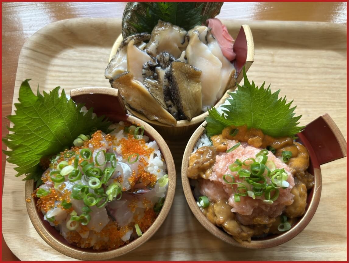 贅沢な桶丼。一口ごとに違うおいしさが楽しめ、
